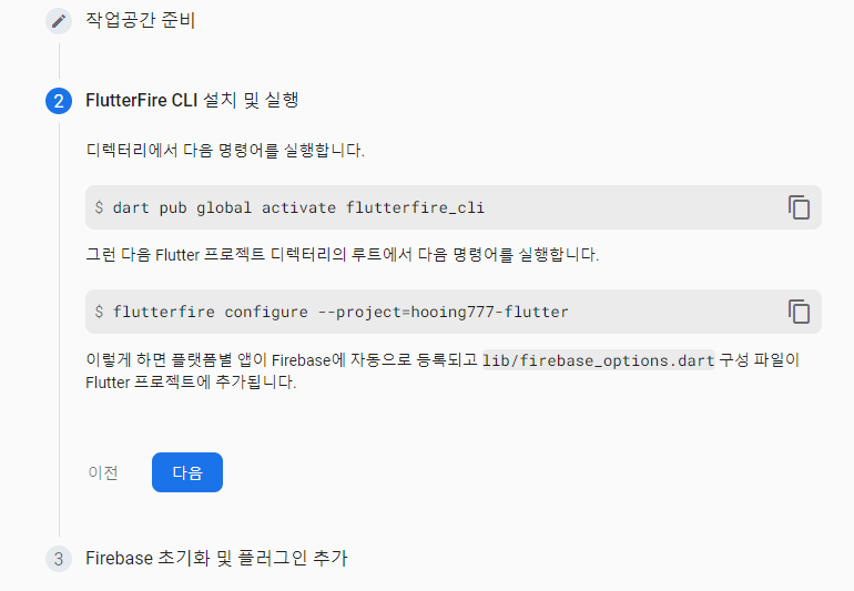 파이어베이스에 생성한 프로젝트로 들어가서 플러터 아이콘을 눌러준다
